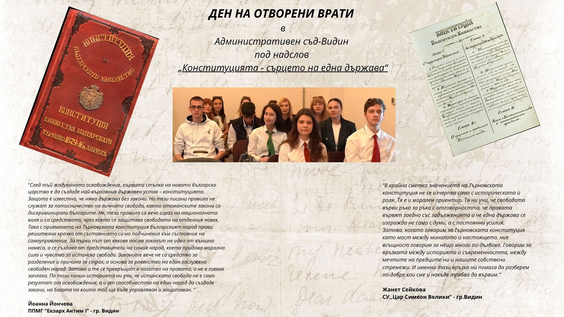 На 16 април 2026 г. Административен съд – Видин проведе Ден на отворени врати, посветен на Деня на Конституцията, под надслов „Конституцията – сърцето на една държава“. Събитието бе открито от председателя на съда съдия Антония Генадиева и заместник-председателя на съда съдия Росица Славчева. Сред гостите бе г-н Владко Вълчев – старши експерт по обществени науки, гражданско образование и религия в РУО – Видин, както и преподаватели по български език и литература, история и гражданско образование, подкрепили участието на своите ученици в конкурса.
